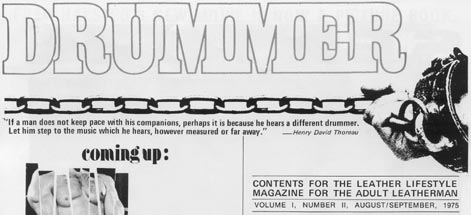 Well known Drummer Magazine first appeared in 1975. In its original format it was primarily a magazine for -very good- leather stories but later it became more of a photo magazine. Drummer has long been the leading magazine for mostly American Leathermen. In 1992 it was taken over by a Dutch company but Drummer ceased to exist as a magazine in September 1999.