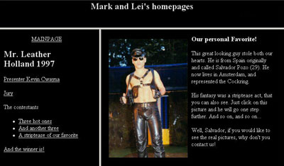 In 1996 our computer ran on Windows 3.11, we had access to the internet through a 14400 bps modem and we browsed the net with Netscape 1.2. The internet was dominated by the US, so we decided to have our website in English. That way the largest number of visitors could at least read what we had to say. From day one we wanted to show them our love for leather as can be seen by the first pictures we published. Early 1997 we introduced frames and a report on the Mr. Leather Holland elections with a lot of pictures. It wasn't easy to digitalise those pics in a time when we didn't have a digital camera yet, or a scanner, but we had our ways.